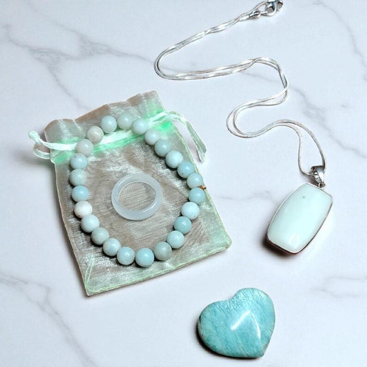 Amazonite Crystal Jewelry Healing Set Pendant Necklace, Bracelet, Heart Stone & Ring with Gift Bag
