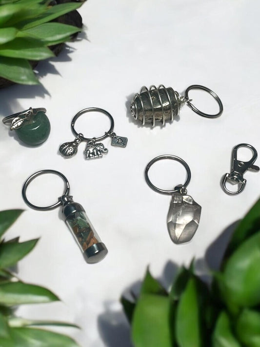 Abundance & Protection Crystal Keychain Set – Green Aventurine Apple, Pyrite Spiral, Smoky Quartz, Mini Gem Jar, and Lucky Charms