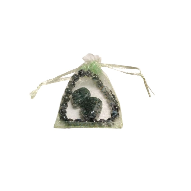Harness the stabilizing energy of Agate and the revitalizing power of Bloodstone with this grounding crystal set. Featuring a sleek Agate 8mm beaded bracelet paired with two polished Bloodstone tumbled stones, this set supports strength, courage, and emotional stability.