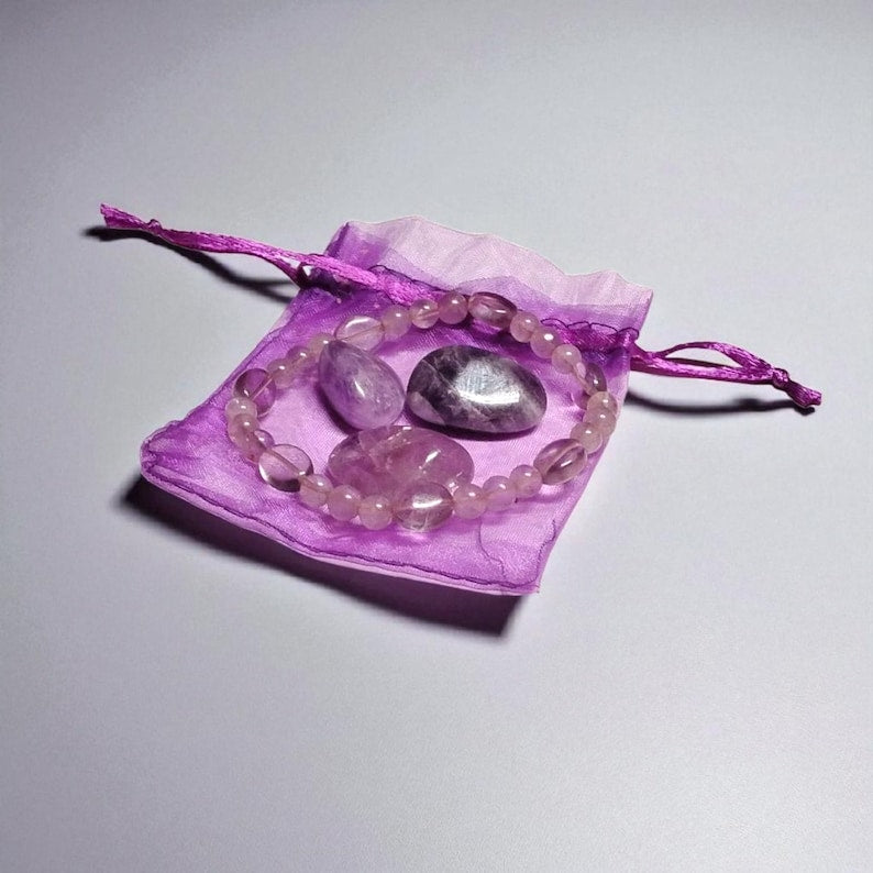 Invite peace, clarity, and higher guidance into your life with this soothing amethyst crystal set. Featuring a beautiful amethyst bead bracelet and three polished amethyst tumbled stones, this collection is perfect for enhancing spiritual awareness, calming the mind, and encouraging restful sleep.
