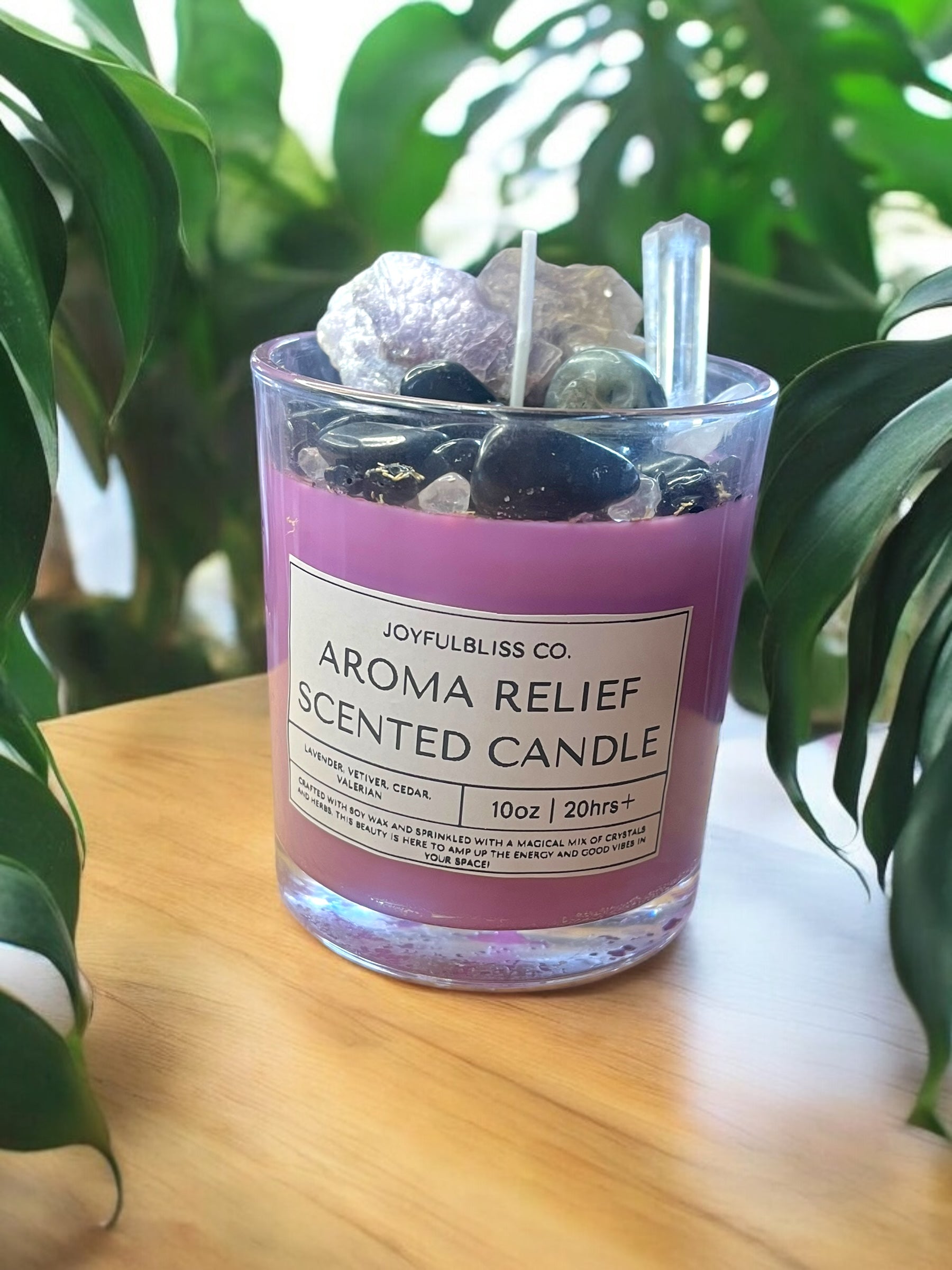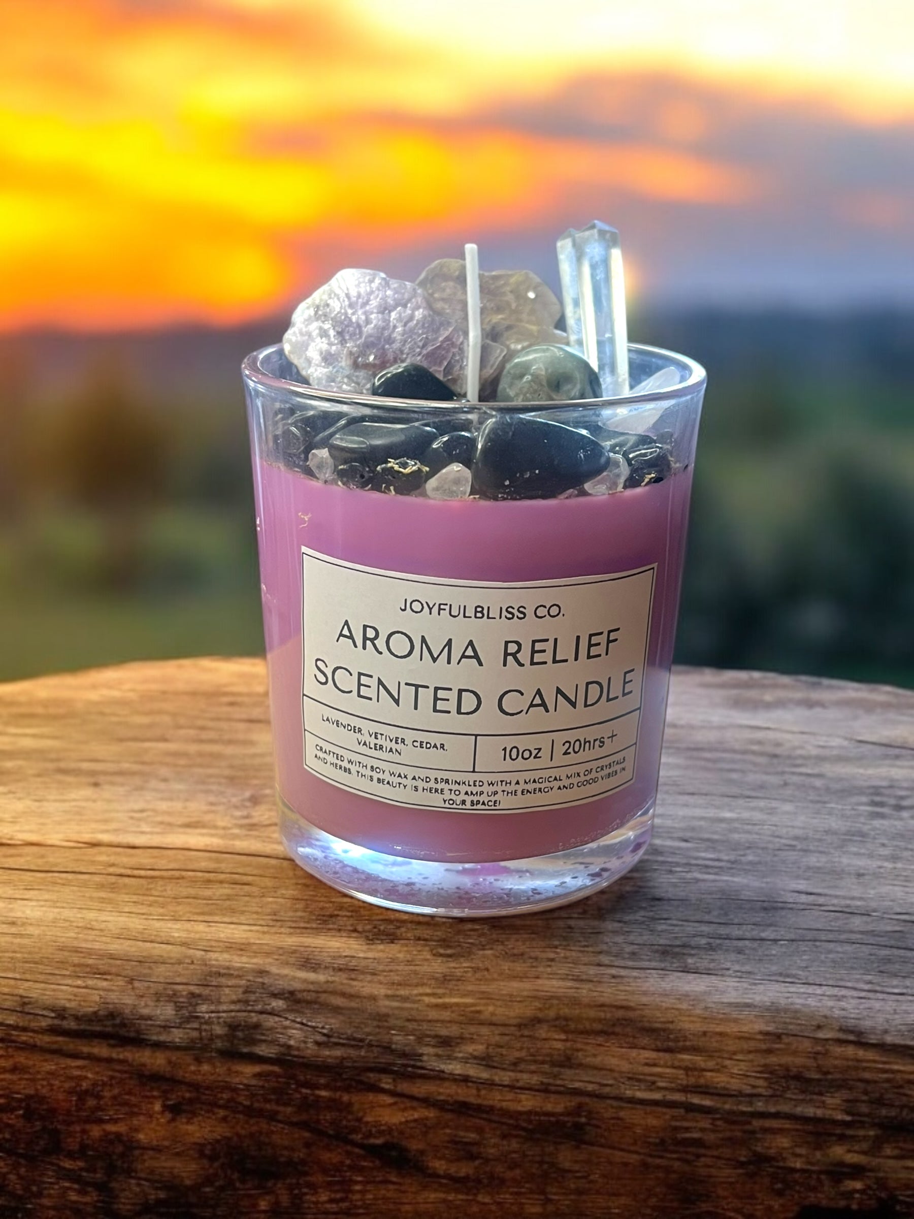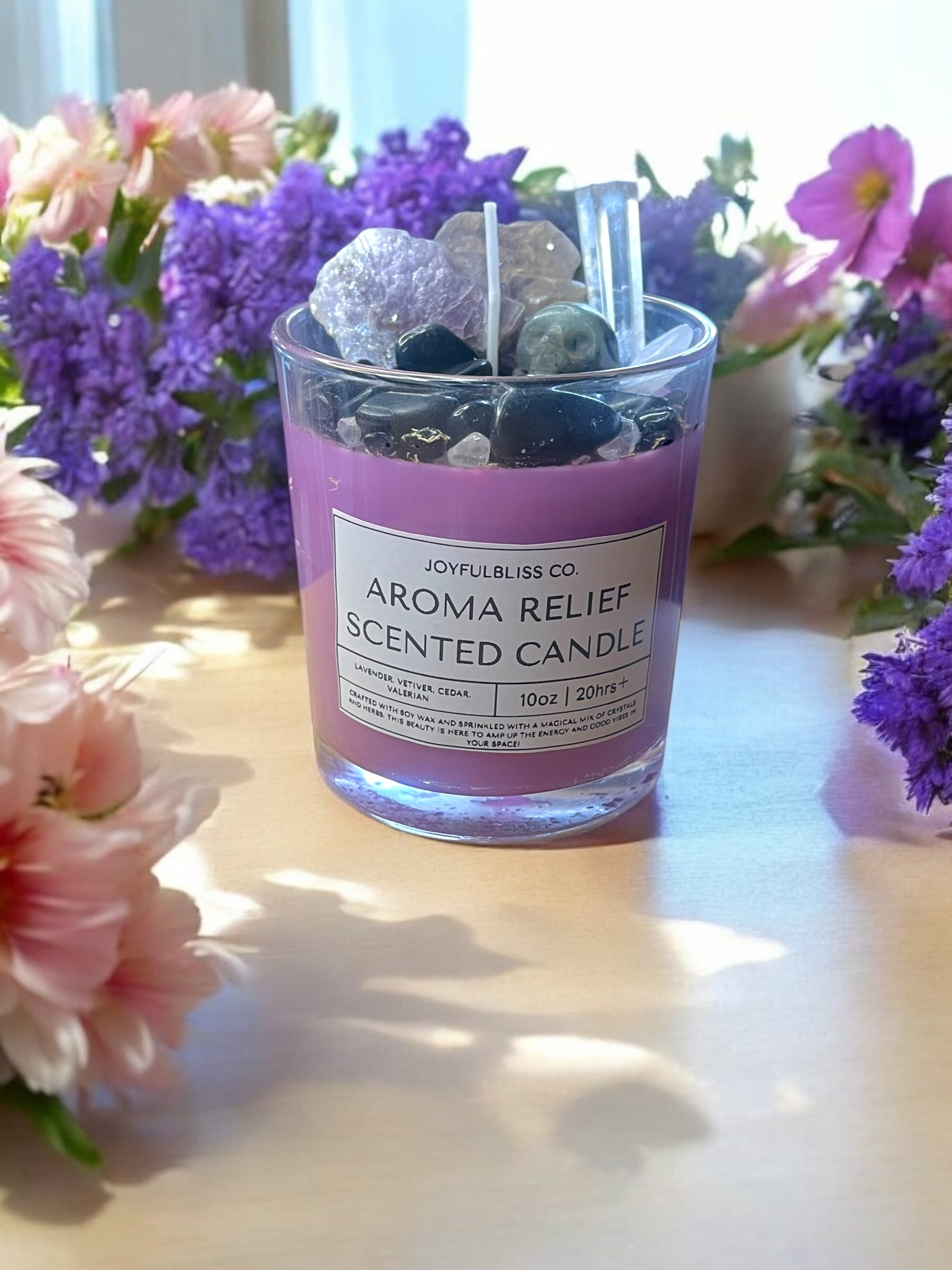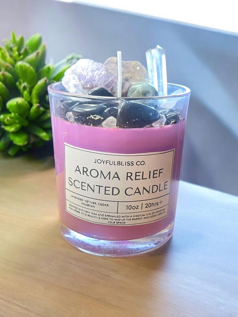 Soothe your senses and bring serenity into your space with the Aroma Relief Scented Candle by JoyfulBliss Co. This 10oz soy candle blends earthy, tranquil aromas with grounding crystals to help relieve tension, ease mental overload, and promote a calming atmosphere—perfect for your unwind rituals.