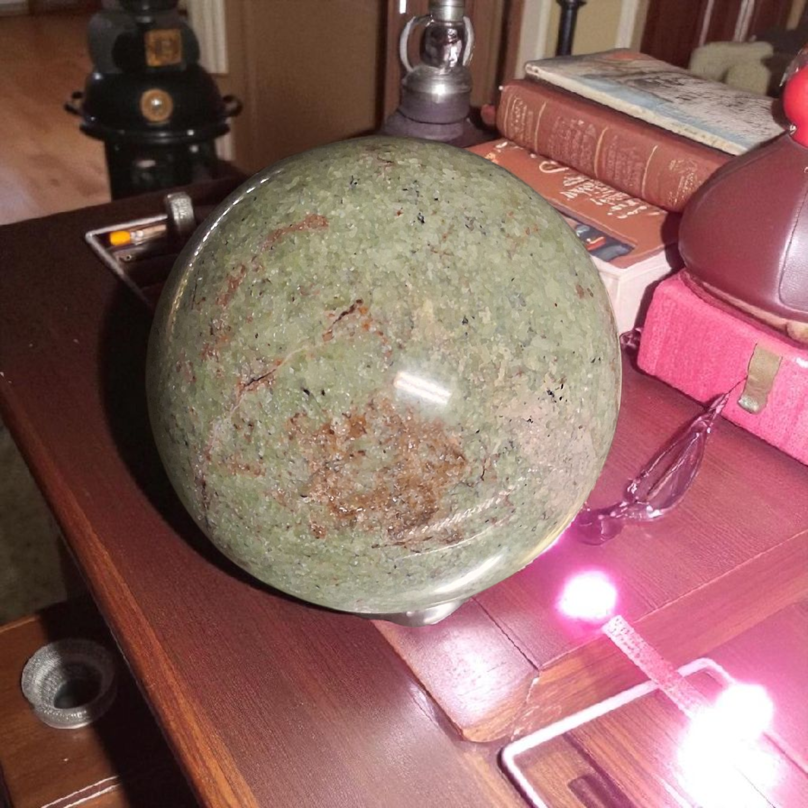 Invite harmony, renewal, and heart-centered energy into your space with this 80mm Chrysoprase Sphere, beautifully polished to reveal its natural green patterns. Resting on a classic wooden stand, this crystal ball makes a stunning décor piece as well as a powerful spiritual tool.