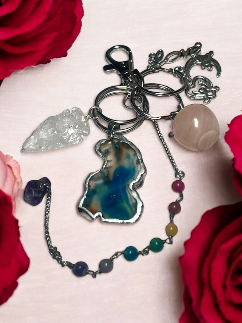 Crystal Keychain Set – Healing Gemstone Charms with Chakra Chain, Agate Slice, Rose Quartz, and Arrowhead