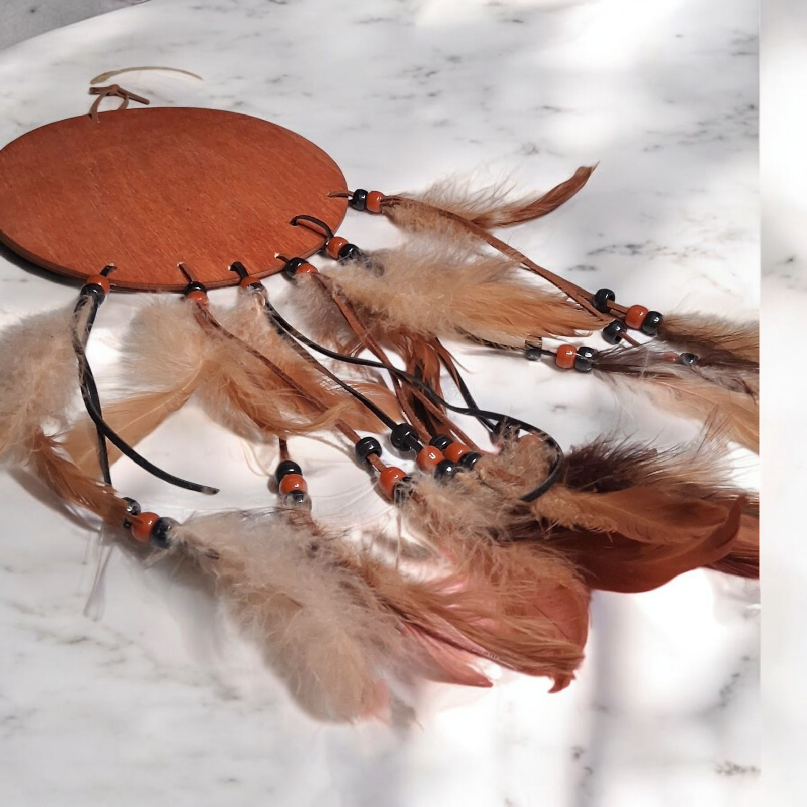 Each strand of feathers is adorned with wooden and black beads, creating gentle movement and a grounded, organic aesthetic. Traditionally believed to filter out negative dreams while welcoming peaceful energy, this hanging piece also doubles as a symbol of freedom, connection to nature, and inner strength.