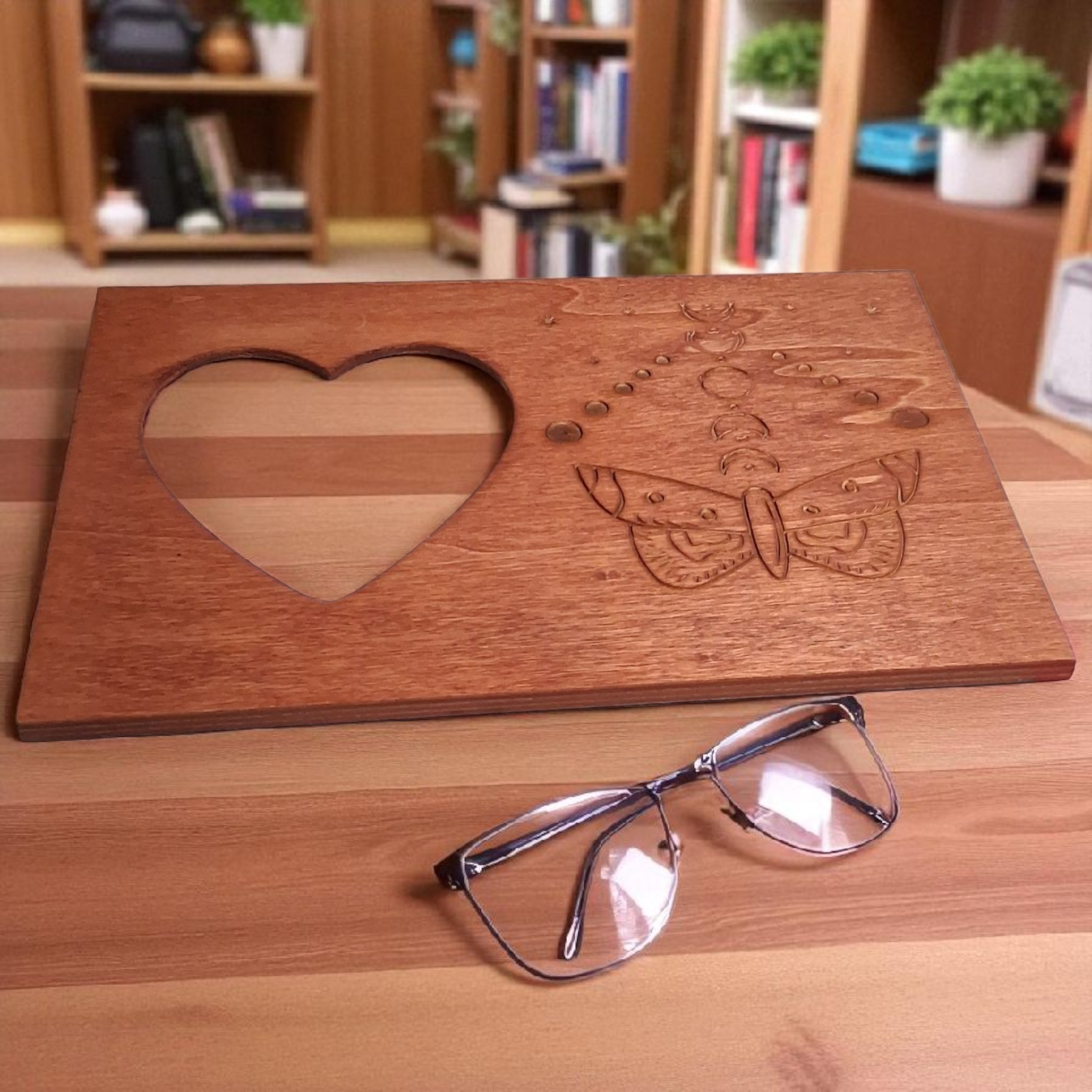 Engraved Wooden Heart Picture Frame – 6x9 Luna Moth & Moon Phase Design – Boho Spiritual Home Decor