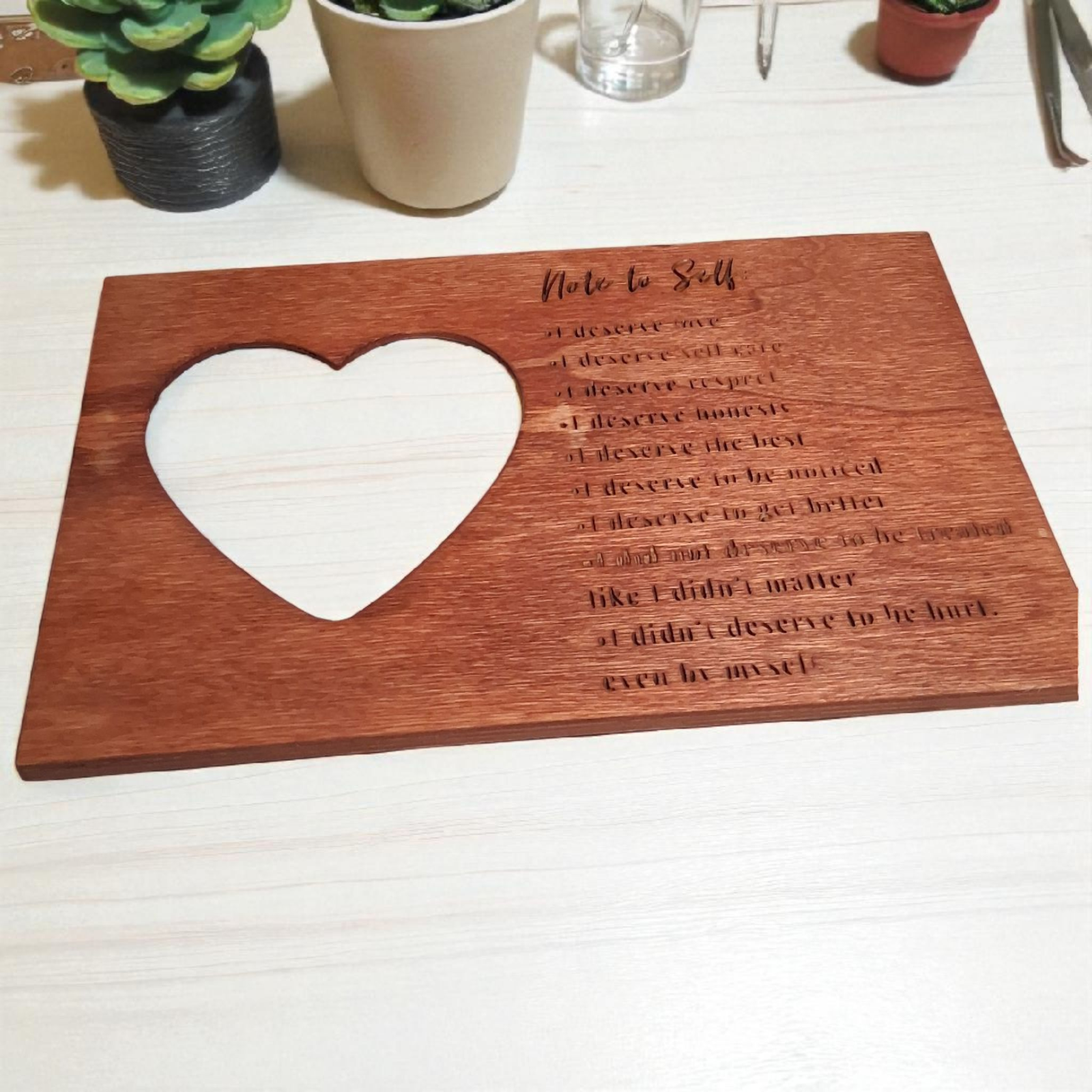 Engraved Wooden Heart Picture Frame – “Note to Self” Self-Love Affirmation – 6x9 Inspirational Healing Decor