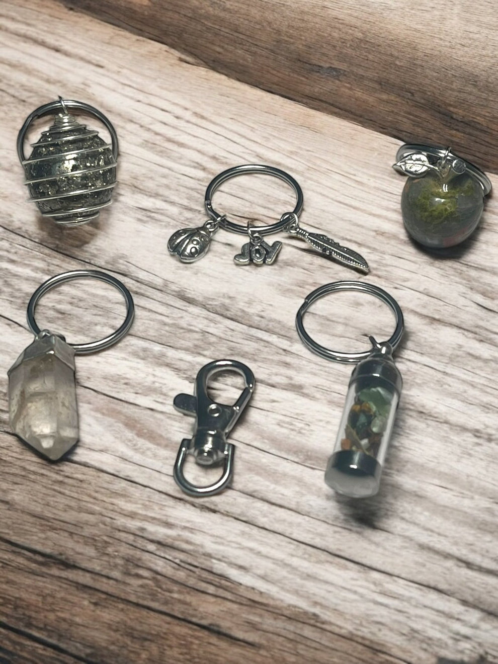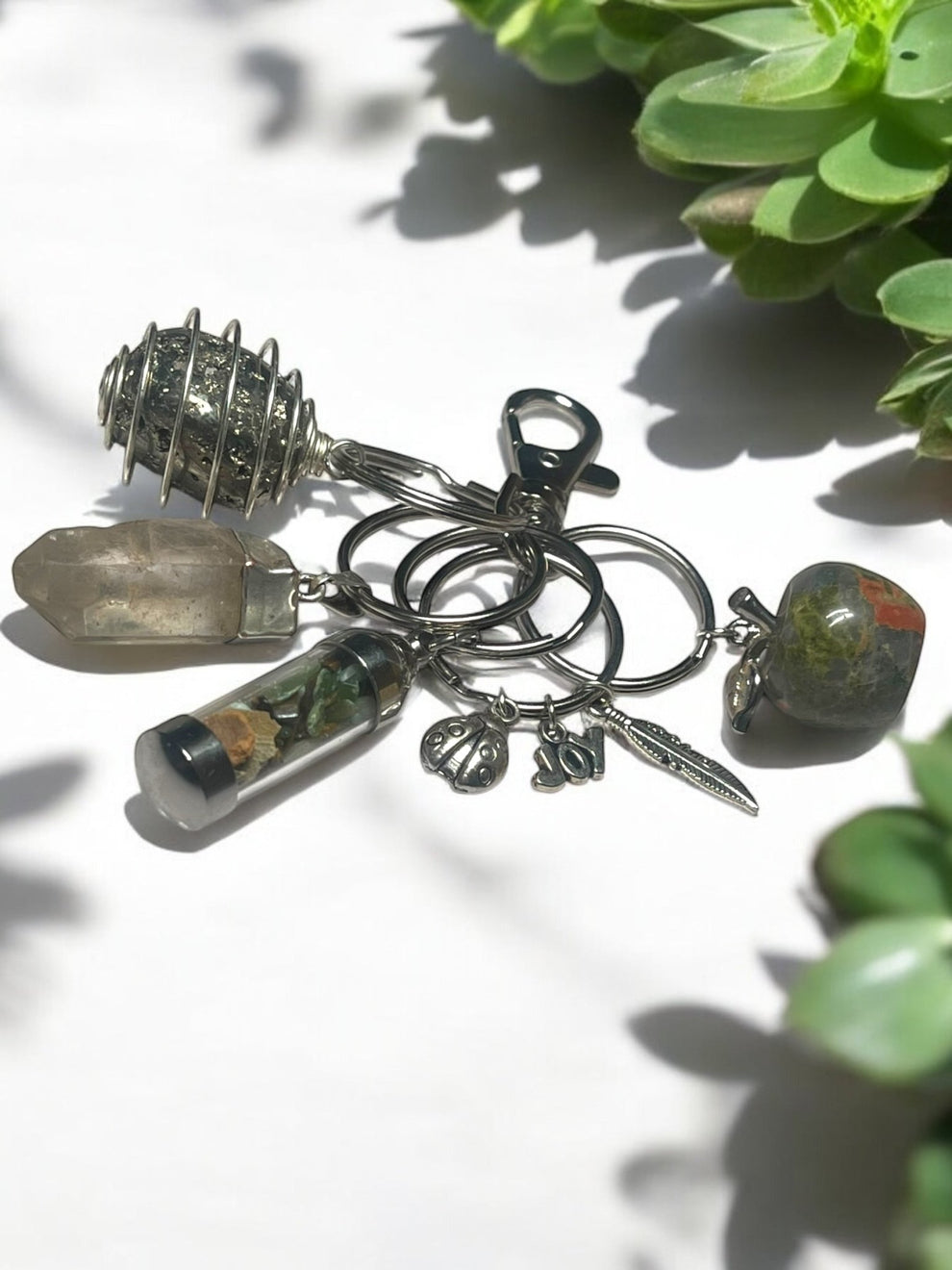 Grounding & Abundance Crystal Keychain Set – Pyrite Spiral, Smoky Quartz Point, Unakite Apple, Mini Gem Jar & Lucky Charms