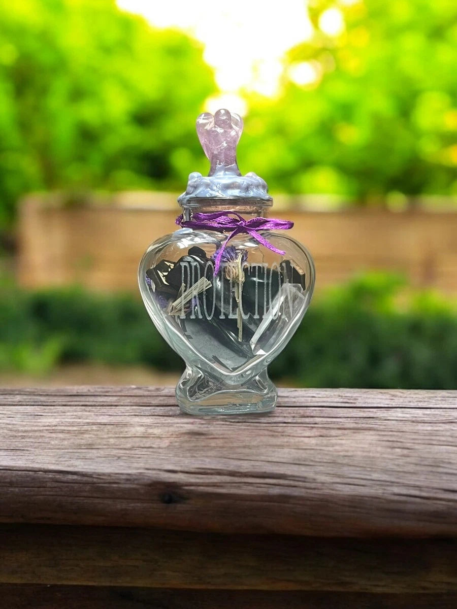 • Handcrafted heart-shaped glass jar etched with “PROTECTION”