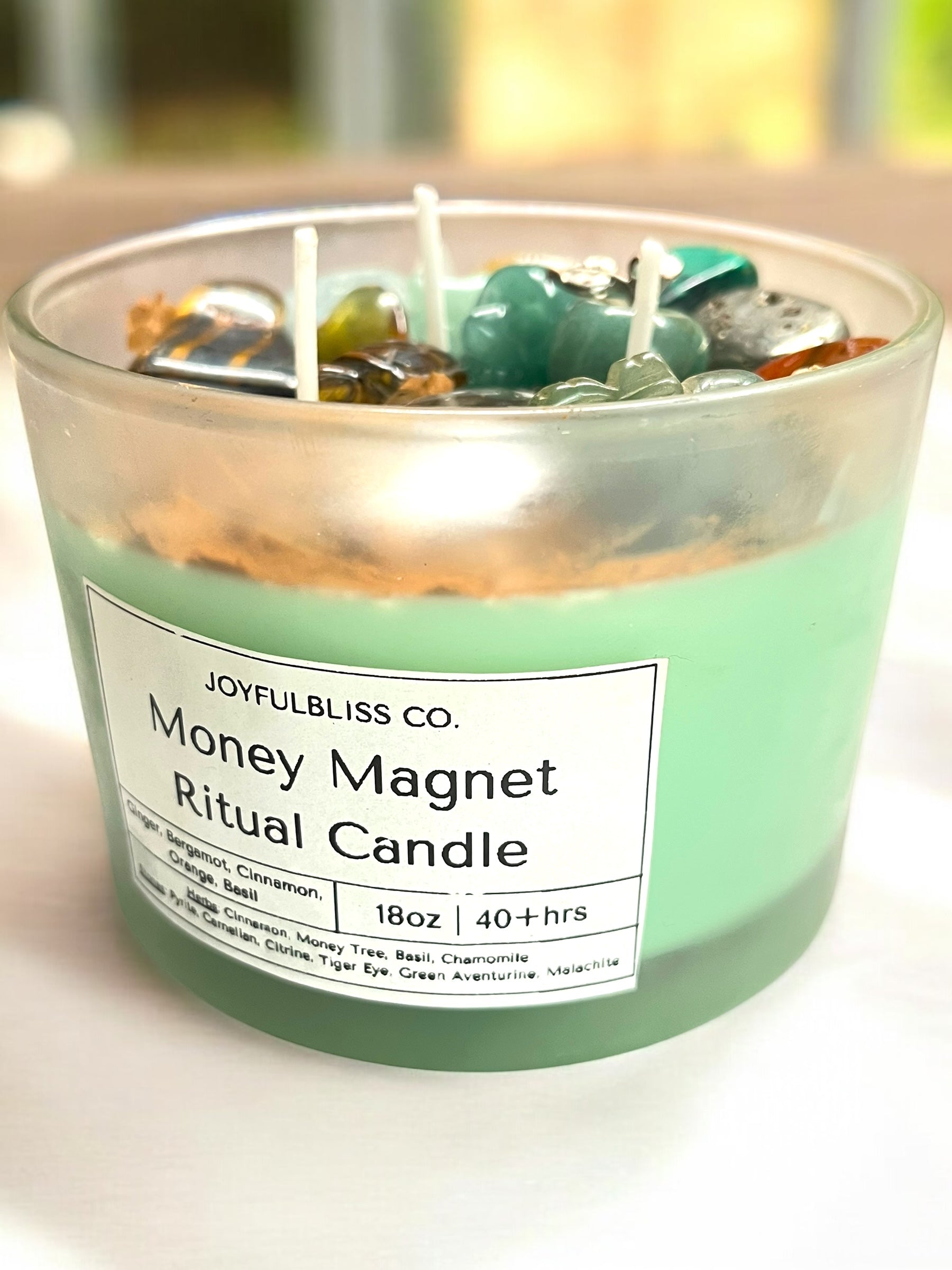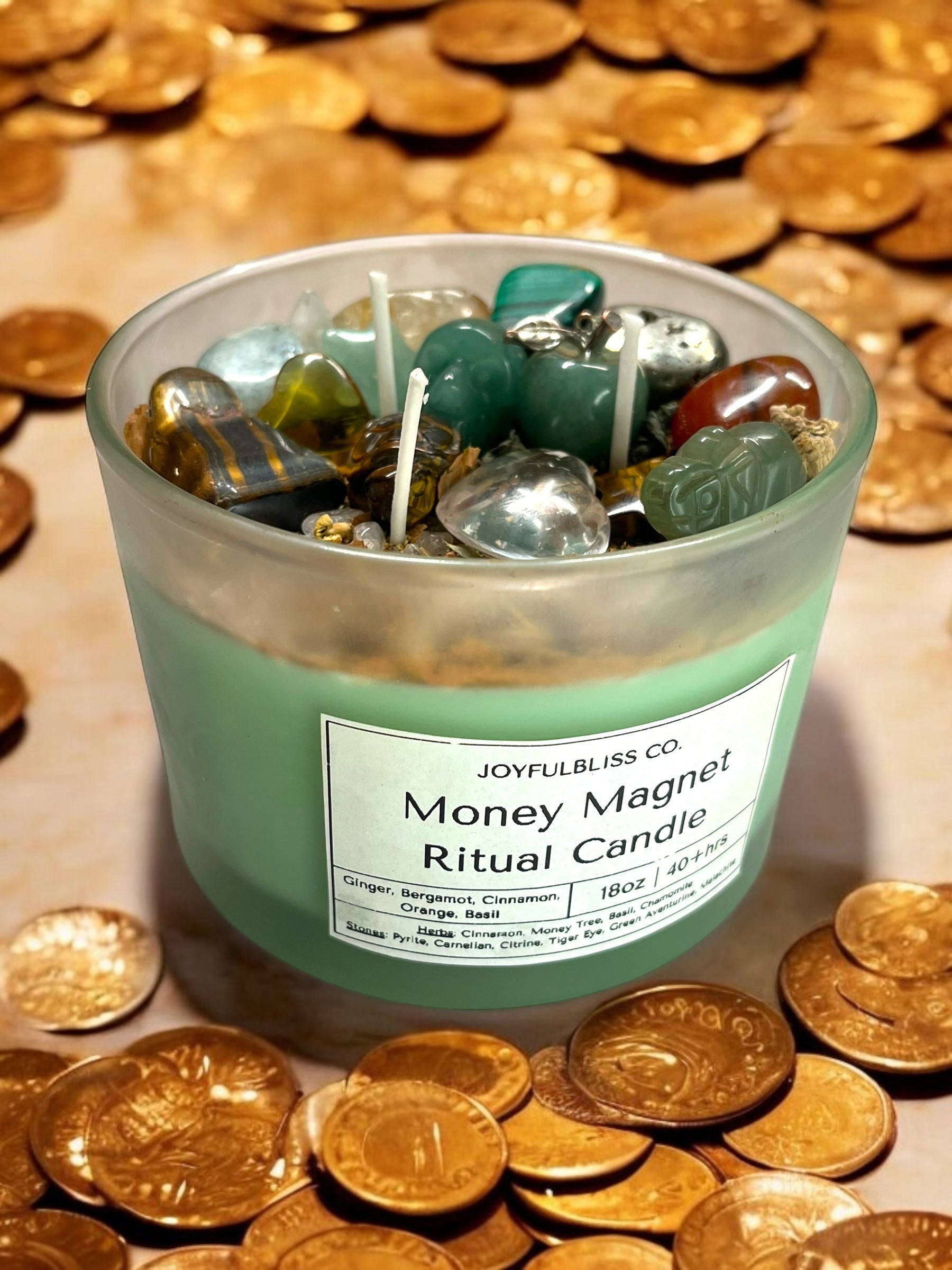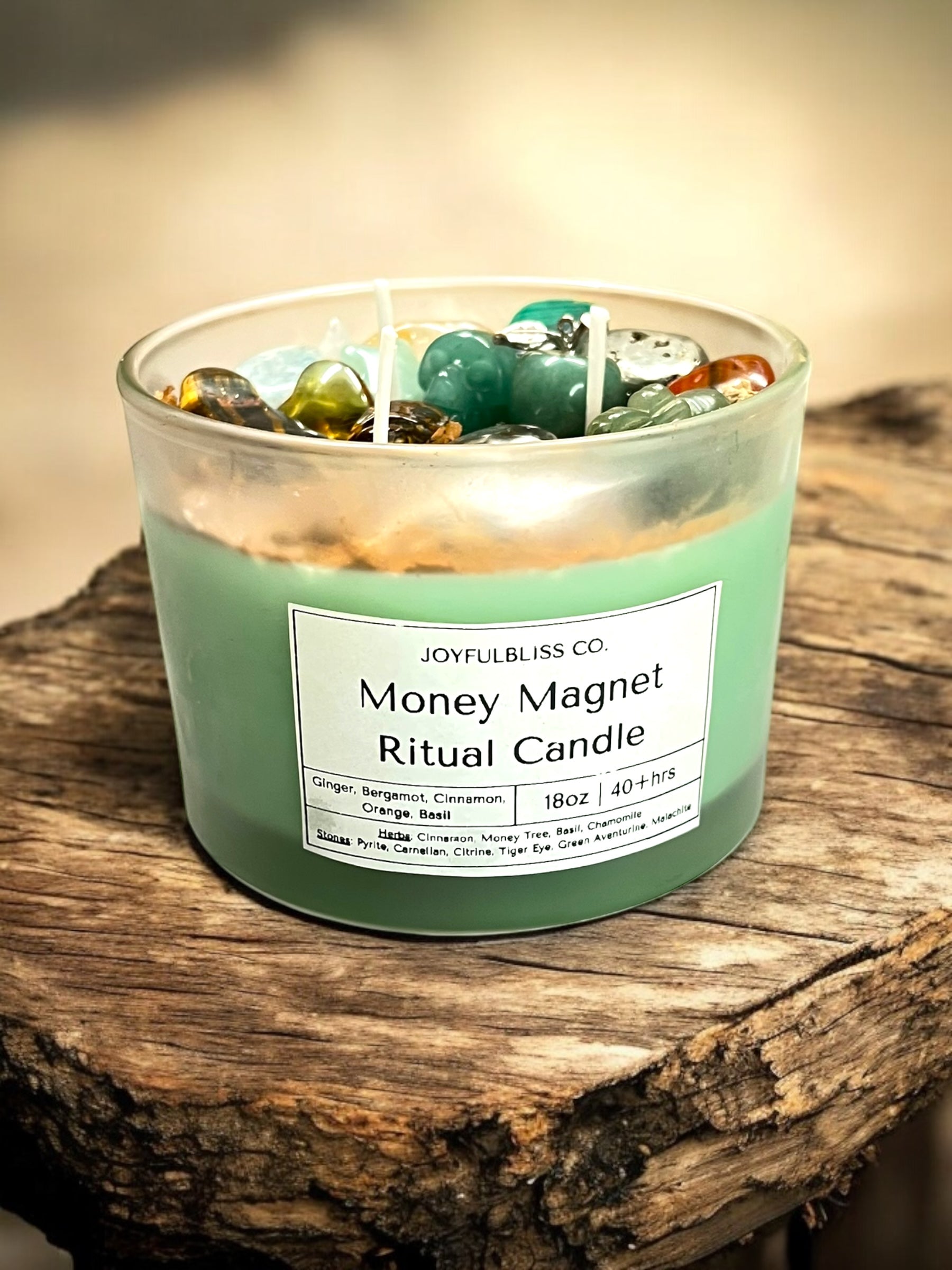 Manifest abundance with the power of intention. The Money Magnet Ritual Candle by JoyfulBliss Co. is crafted to align your energy with wealth, prosperity, and financial success. This 18oz hand-poured soy candle is infused with a potent blend of high-vibration crystals and sacred herbs, designed to remove financial blockages and amplify your manifestation rituals.