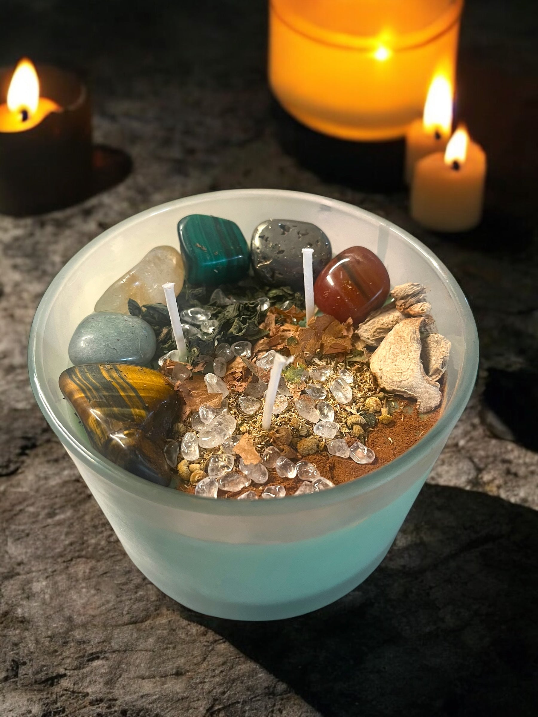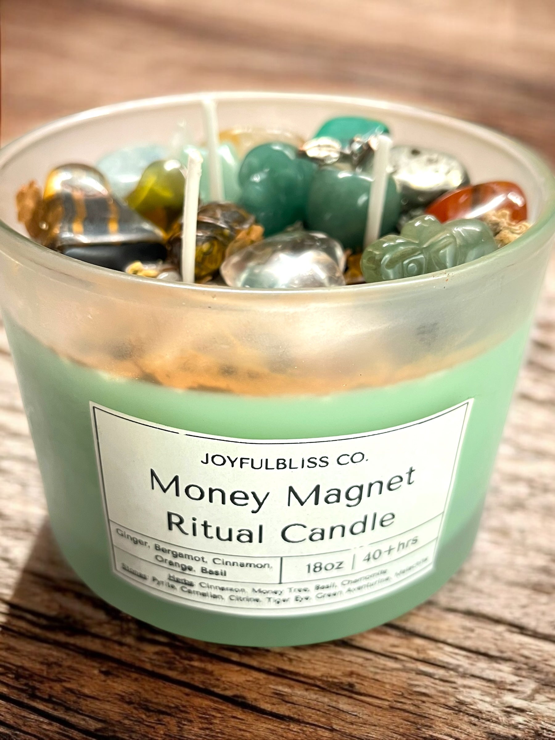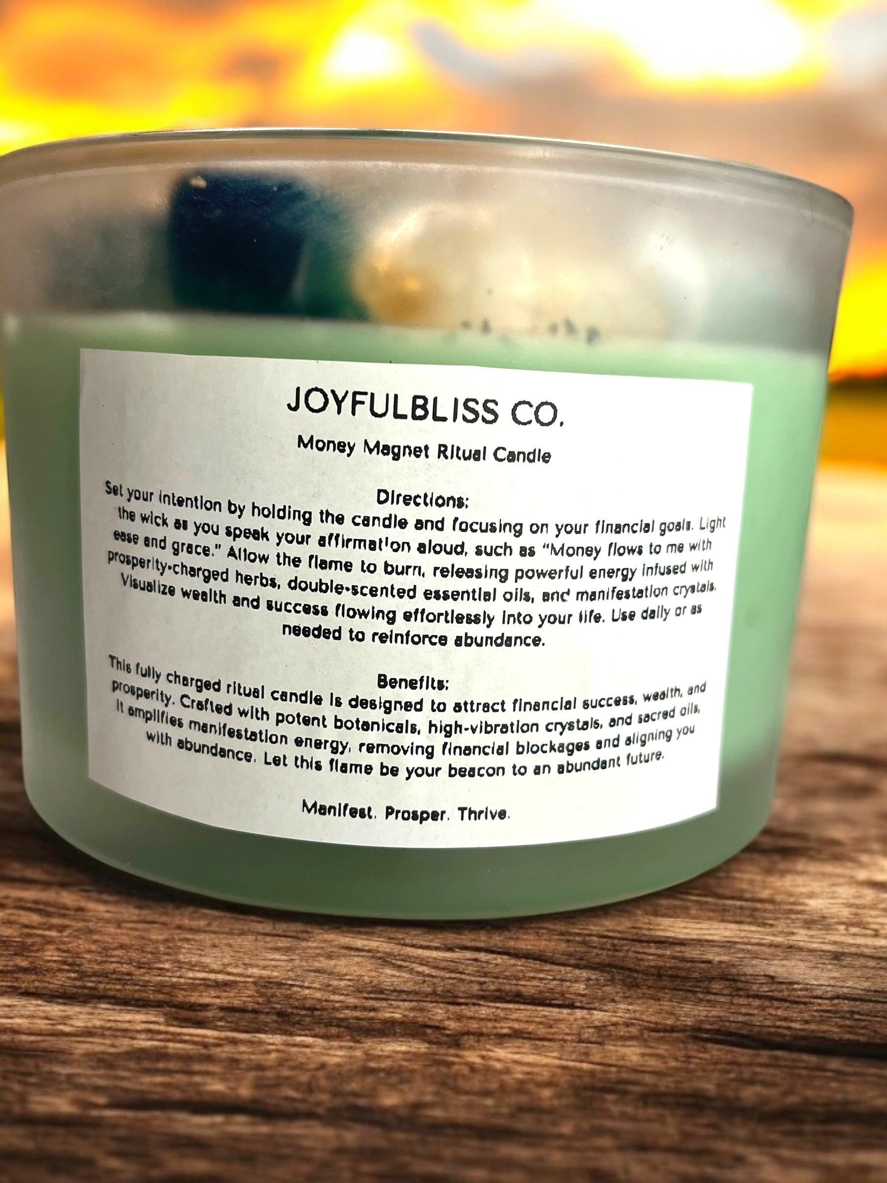 Manifest abundance with the power of intention. The Money Magnet Ritual Candle by JoyfulBliss Co. is crafted to align your energy with wealth, prosperity, and financial success. This 18oz hand-poured soy candle is infused with a potent blend of high-vibration crystals and sacred herbs, designed to remove financial blockages and amplify your manifestation rituals.
