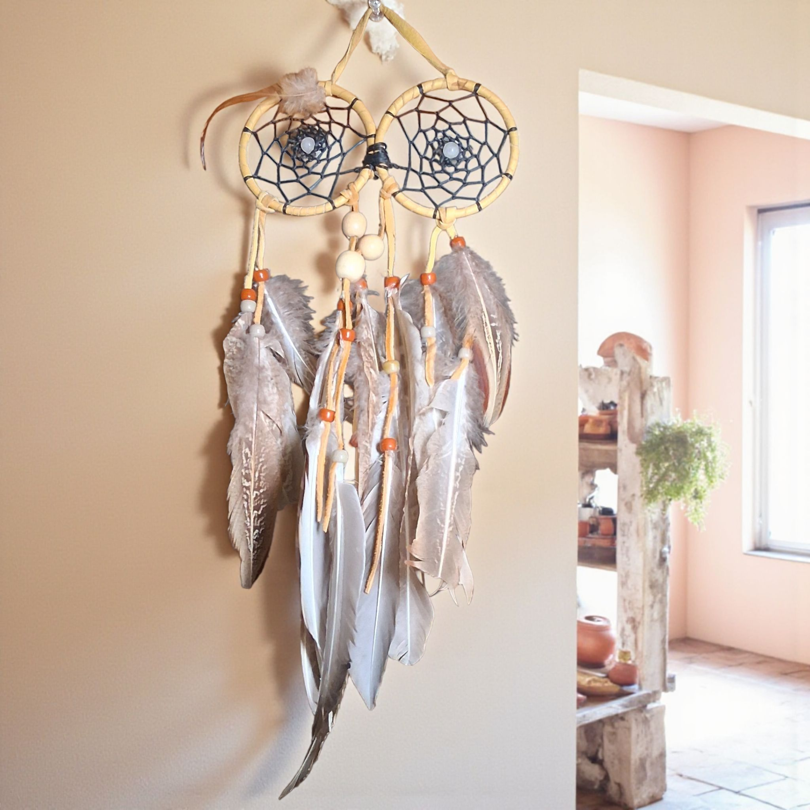 Owl-Themed Double Dream Catcher – 15x6 Handmade Feather Wall Hanging for Protection & Wisdom