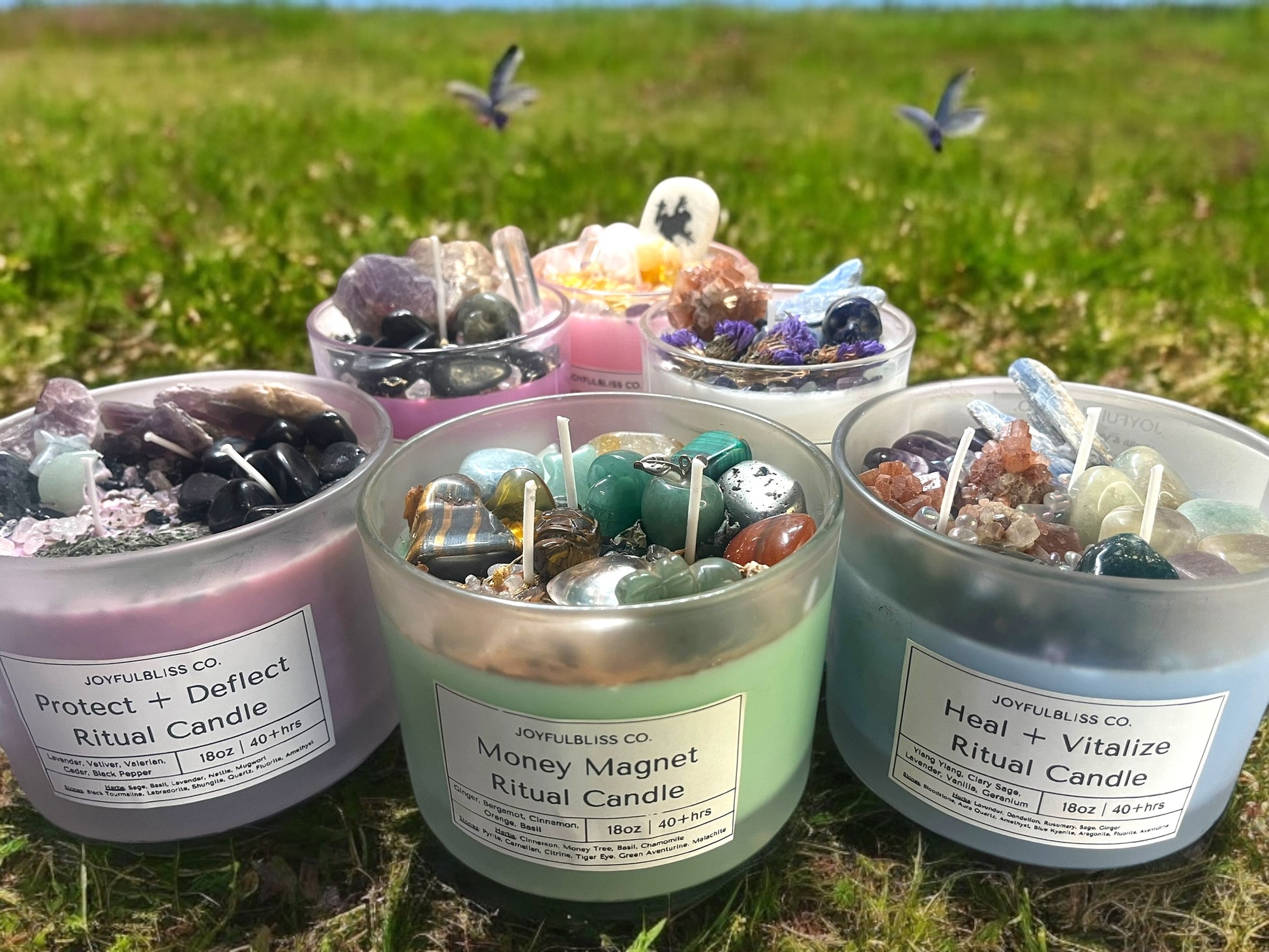 Safeguard your energy and elevate your spiritual defense with the Protect + Deflect Ritual Candle by JoyfulBliss Co. This 18oz soy candle is handcrafted with sacred herbs, powerful protective crystals, and a deeply grounding essential oil blend to repel negativity, banish low vibrations, and fortify your aura.