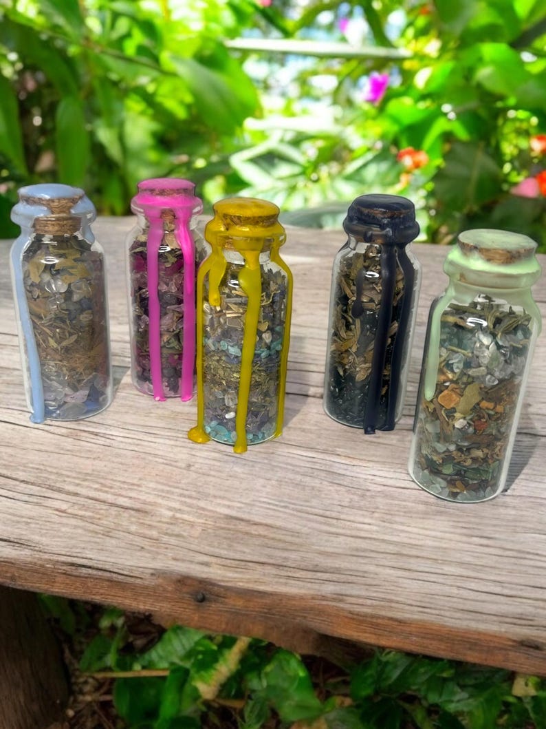 Introducing our extraordinary spell jars! Crafted with precision, these enchanting jars measure 3 inches by 1 inch and are meticulously filled with a selection of powerful crystals, gemstones, and herbs. Each element is thoughtfully placed in a glass jar, infused with reiki energy, and sealed with colored wax to amplify their ability to attract and manifest your desired intent.