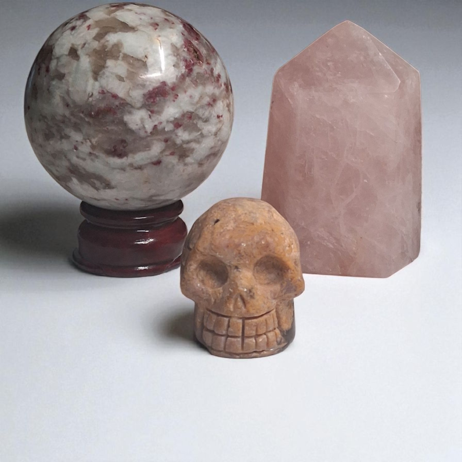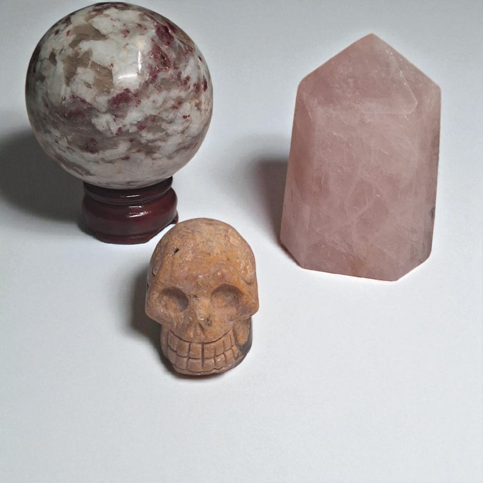 Rubellite Tourmaline Sphere (80mm), Rubellite Tourmaline Skull (2"), & Rose Quartz Tower (3") – Crystal Healing Set