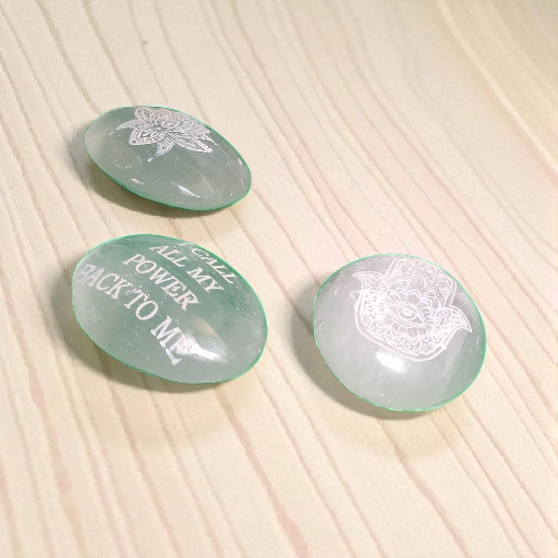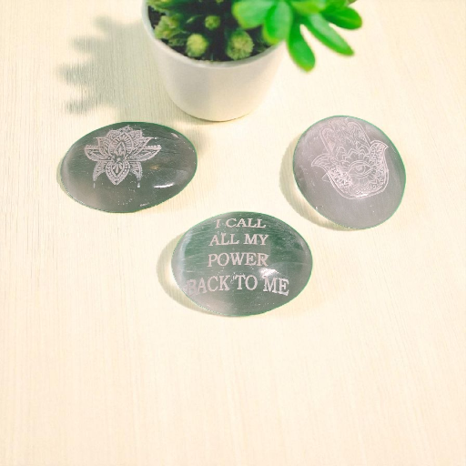 Bring clarity and cleansing energy into your daily practice with this 2-inch engraved selenite palm stone. Smoothly polished to fit comfortably in the hand, this stone is etched with a sacred design (patterns vary), making it both a powerful spiritual tool and a unique piece of art.