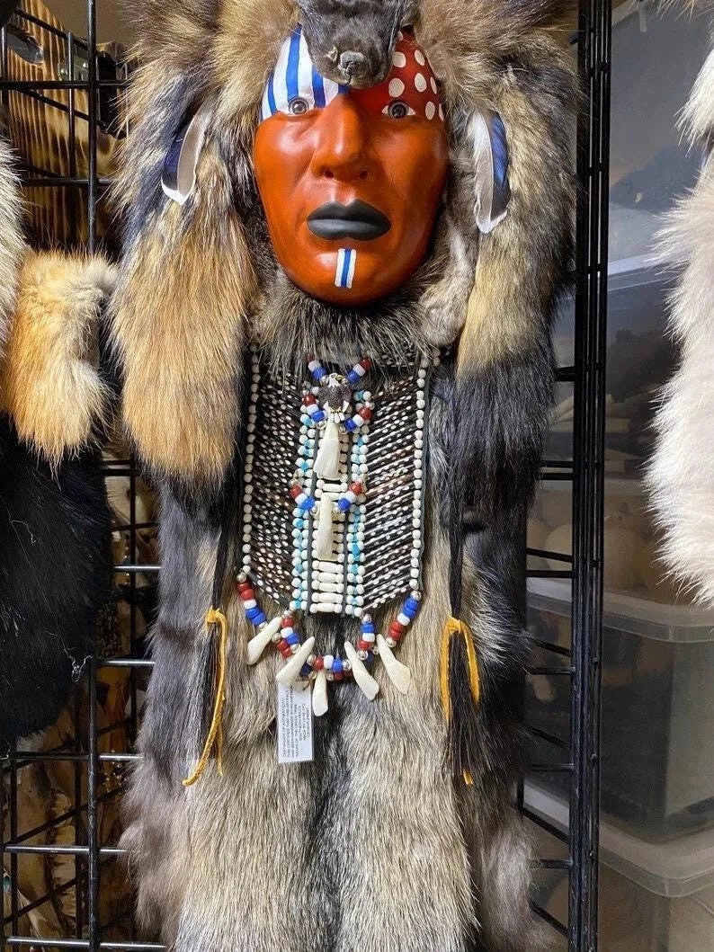 Adorned with Authentic Materials: Features a complete coyote pelt, a deer bone chest ornament, buffalo teeth, and glass beads, which bring an authentic touch to each piece.
