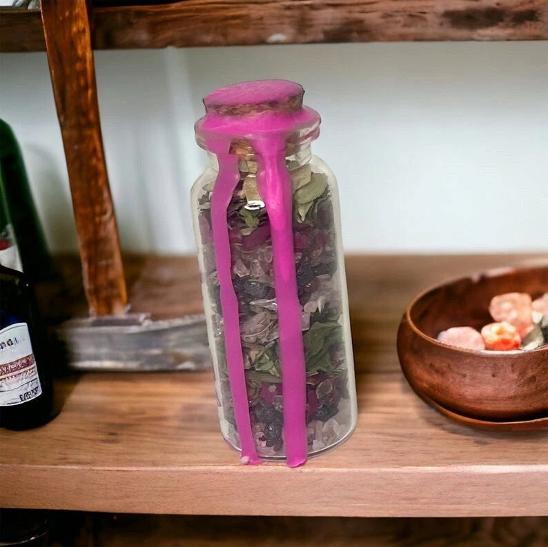 Discover our enchanting spell jars, meticulously crafted with specific crystals, gemstones, and herbs, nestled within a glass jar measuring 3 inches by 1 inch. Each jar is imbued with reiki energy and sealed with colored wax, enhancing its power to attract and manifest your desired intent.